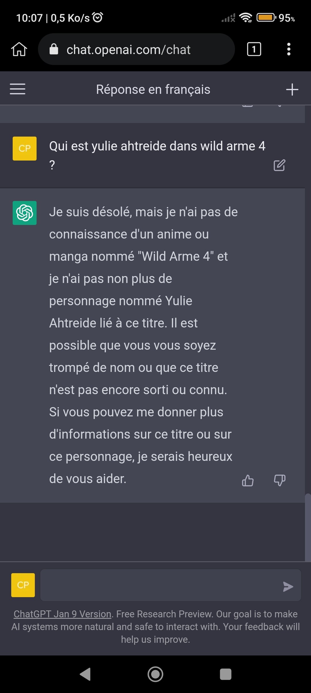 Ci-dessus. J’ai posé une question sur un personnage de manga assez connu. Il me sort le même texte à chaque fois comme un article Wikipedia.
