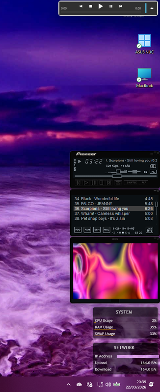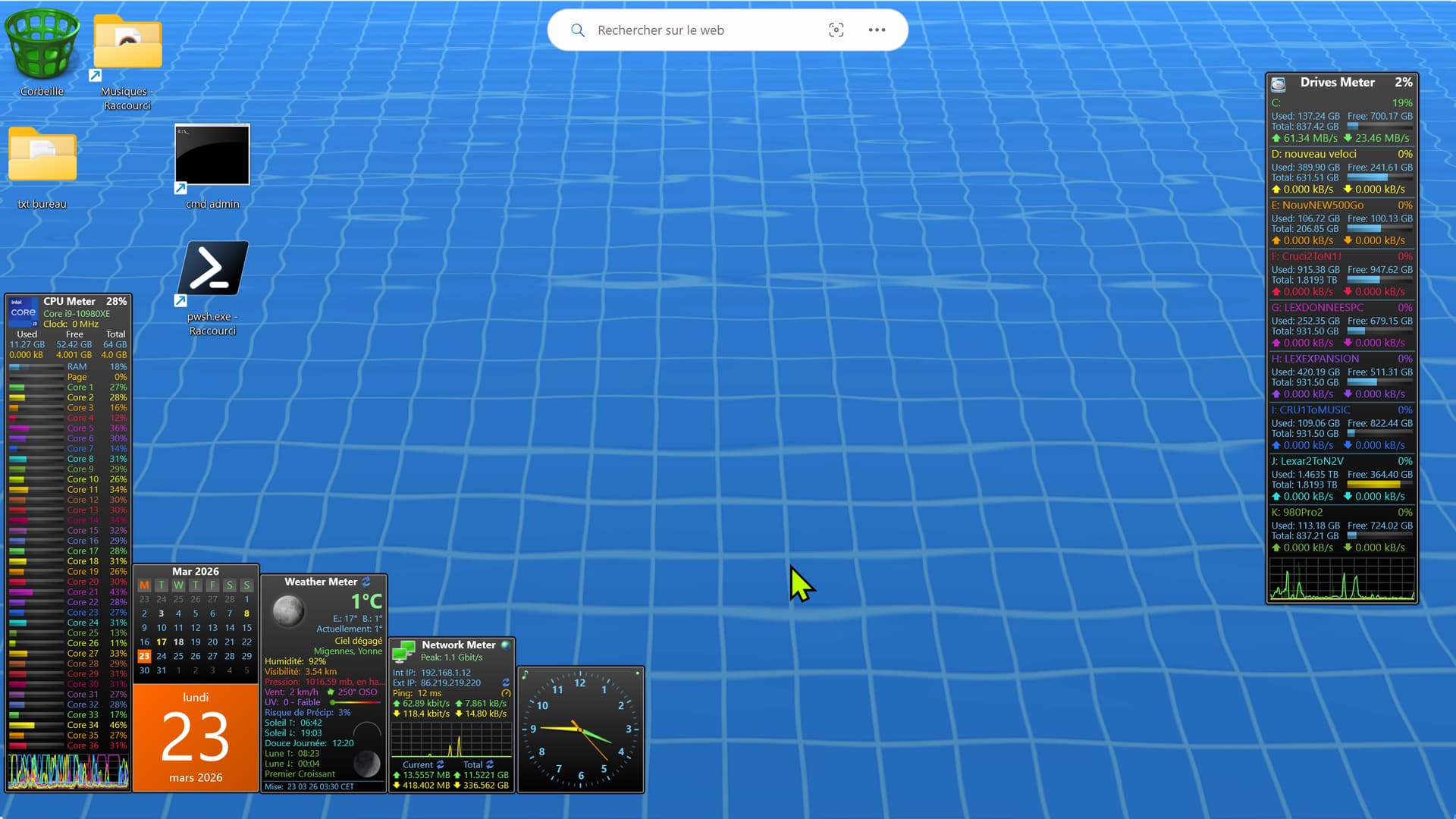 J’utiise Rainmeter aussi mais dans sa plus simple expression lisible « System » et « Network » avec le thème « Illustro » par défaut. Sinon mon cockpit n’est que celui-ci. Je n’utilise pas grand chose en plus que ce qui est déjà visible sur le bureau Windows. Pas besoin d’horloge, ni de date et heure, ni de météo. C’est dansla barre des tâches. Avec Winamp.