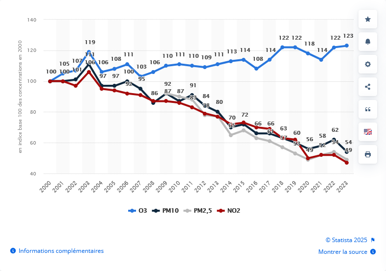 Pour les particules fines et le NO2, on est même redescendu en 2023 en-dessous des niveaux atteints en 2020, alors que les confinements avaient largement fait baisser la pollution.
