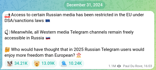 « L’accès à certains médias russes a été restreint dans l’UE en vertu du DSA / des lois de sanctions. En revanche, tous les canaux Telegram des médias occidentaux restent librement accessibles en Russie. Qui aurait pensé qu’en 2025, les utilisateurs russes de Telegram jouiraient d’une plus grande liberté que les Européens ? »