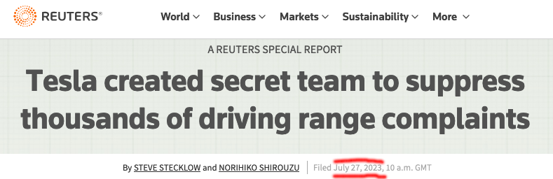 Comme tous les autres, vous feriez bien de vérifier vos sources avant de publier un article car toute cette histoire se base sur un article de Reuters… Qui date d’il y a 10 ans et n’est absolument plus d’actualité puisqu’il ne concernait que les anciens Roadster, même plus produits, et les toutes premières Model S. Je vous recommande de le lire et de bien regarder la date :p…