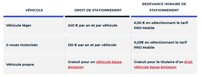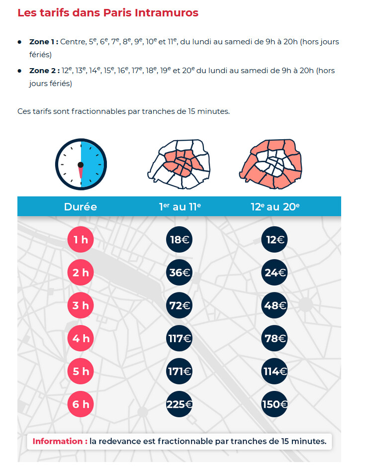 Pour les résidents et professionnels travaillant dans Paris, ça démarre bien à 1.5€ par jour pour une zone limitée (4 zones de stationnement les plus proches de l’adresse de résidence/d’activité) + un abonnement à l’année à partir de 45€ pour les pros :
