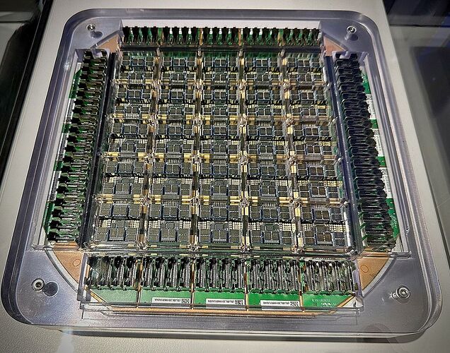 "Cette tuile peut effectuer 9 quadrillions de calculs en virgule flottante par seconde, optimisée pour l’entraînement de l’IA. Je l’ai vue de près aujourd’hui. Chaque tuile de 15 kW contient un réseau de blocs de 5 x 5, chacun composé de 12 piles de modules multipuces D1, avec blindage RF entre elles. Il s’agit de puces d’IA personnalisées par Tesla, avec 362 téraflops par bloc. Des connecteurs tout autour fournissent une bande passante inter-tuile de 36 Tbit/s. Le supercalculateur Dojo ExaPod possède 120 de ces tuiles, pour 1,1 exaflops de calcul optimisé pour l’IA - "