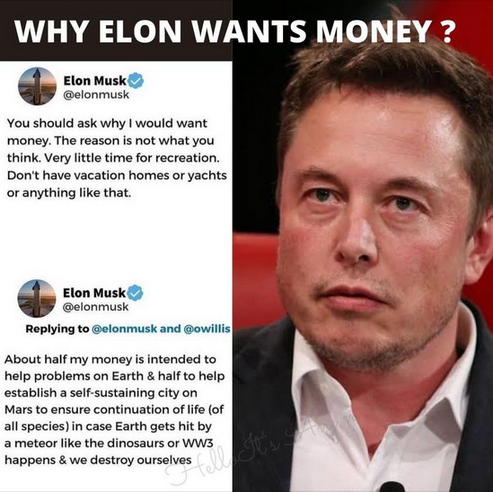 « Environ la moitié de mon argent sert à résoudre des problèmes sur Terre & l’autre pour aider l’établissement d’une ville autonome sur Mars, pour assurer la continuation de la vie (toutes les espèces) au cas où la Terre se ferait frapper par une météorite comme les dinosaures, ou que la 3ème guerre mondiale devenait réalité & et que nous nous autodétruisions nous même. »