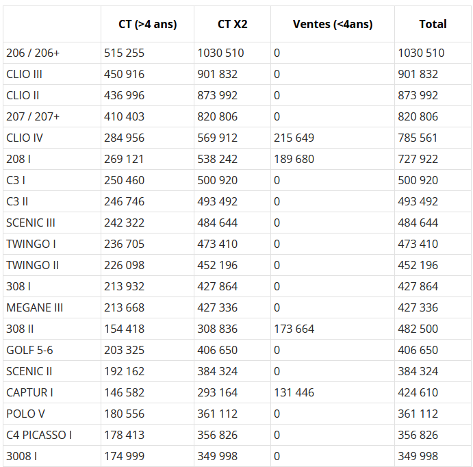 Et il n’y a que 12 françaises dans le top 20, soit beaucoup moins que dans le top 20 du parc automobile français, où il y a 18 modèles français :