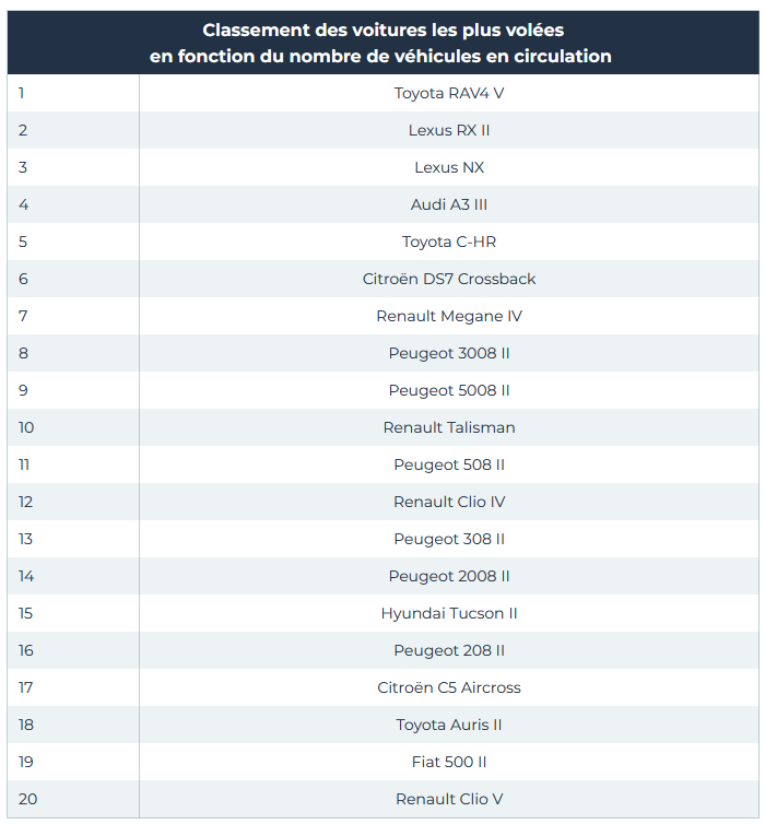 (source : Top 20 des voitures les plus volées en France en 2024 )