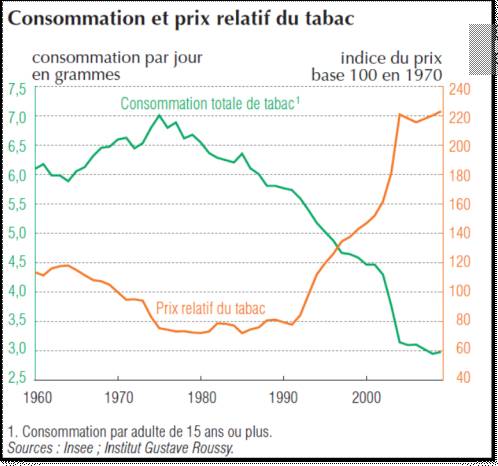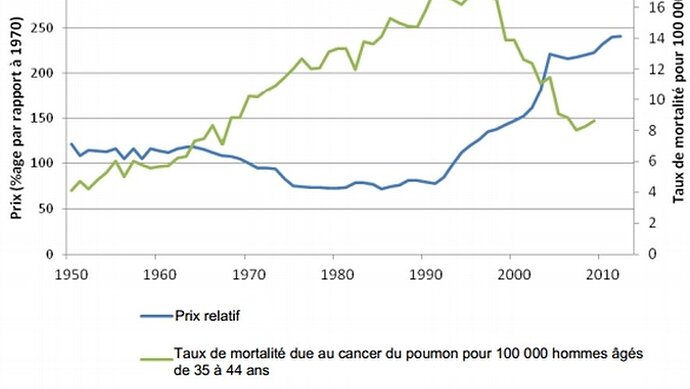 En France, ce décalage est d’ailleurs bien visible, la consommation de tabac a commencé à baisser à partir du milieu des années 70 :