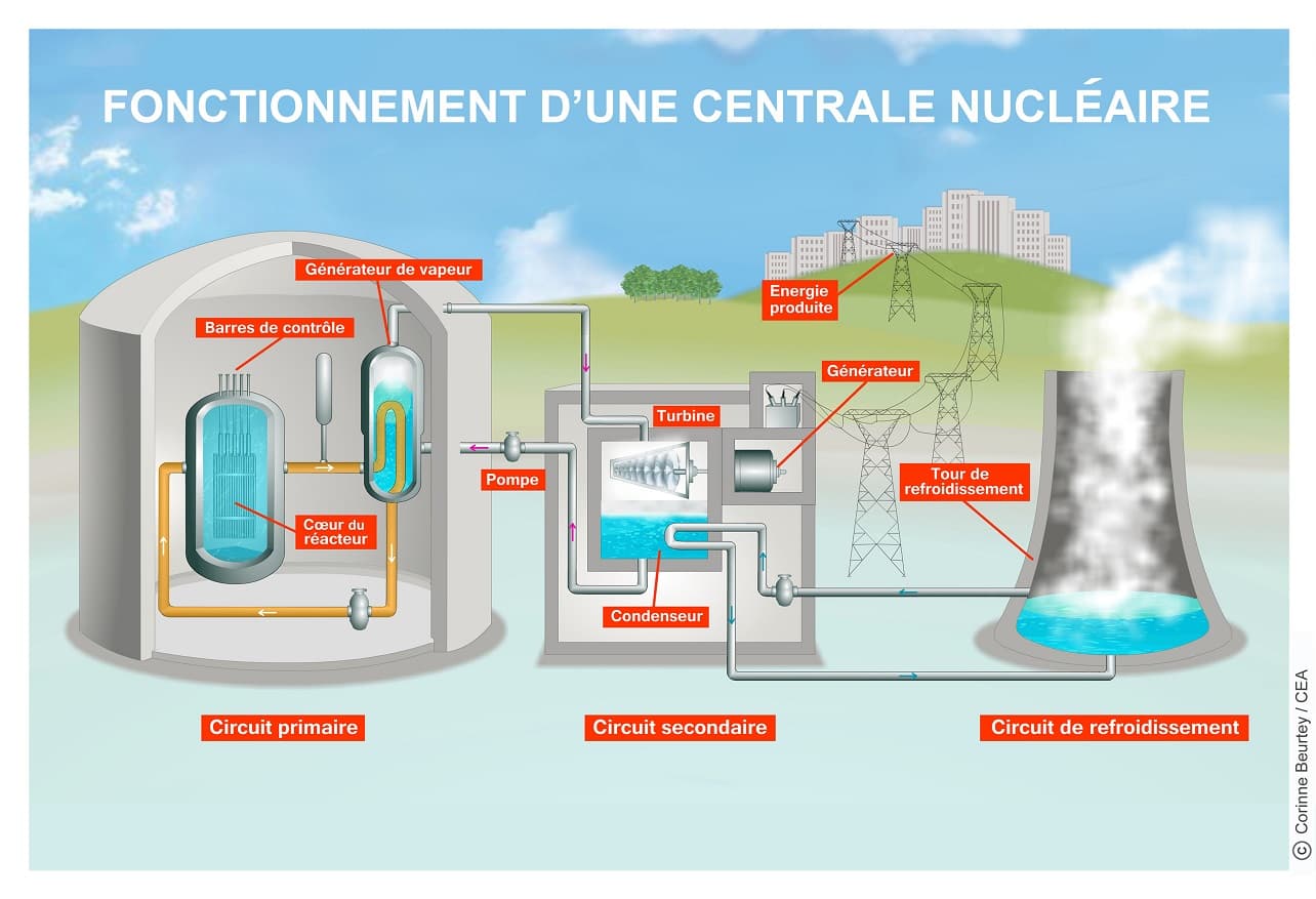 - le tertiaire (ou refroidissement) qui récupère de l’eau depuis un cours d’eau et / ou des aéroréfrigérants (les fameuses cheminées) pour refroidir le secondaire (c’est comme ça que la vapeur retourne à l’état liquide). Cette eau est ensuite en partie rejetée dans le cours d’eau après filtrage ou perdue sous forme de vapeur quand il y a des aéroréfrigérants (le reste est réinjecté dans le circuit et / ou récupéré via les aéroréfrigérants)
