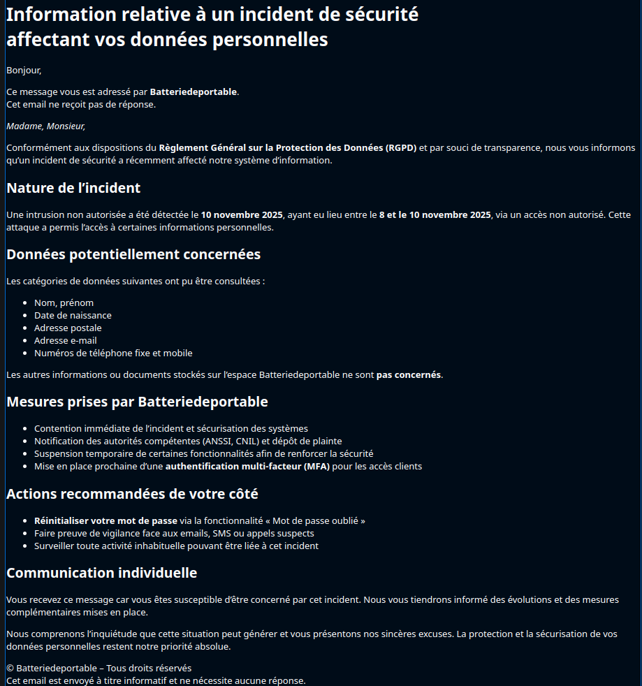 Spécialiste français des batteries et chargeurs, le site web Batteriedeportable a subi une intrusion informatique le mois dernier. Ces dernières heures, les clients ont été informés de l’attaque, car victimes d’un vol de données personnelles.