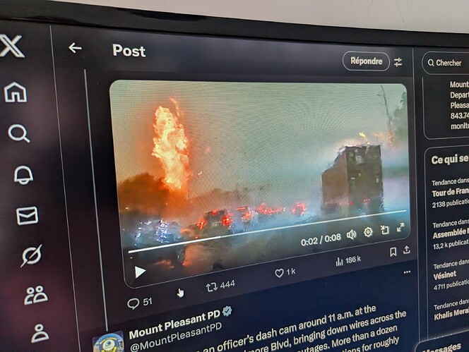 Un éclair impressionnant a frappé la localité de Mount Pleasant, en Caroline du Sud lundi. La police locale a partagé les images saisissantes captées par la caméra embarquée d’un véhicule de patrouille.
