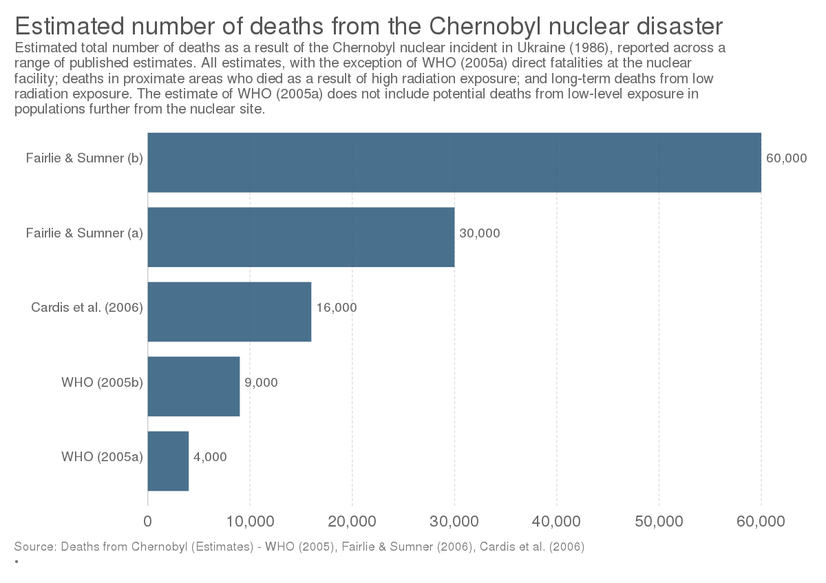 Je crois que tu sous-estimes fortement le nombre de morts et de malades dus à l’accident de Tchernobyl: Tchernobyl. Des chiffres effrayants, trente ans après