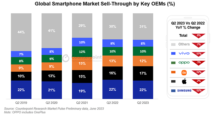 Relis encore une fois le graphique au dessus de @octokitty , Android n’a pas perdu tout ça loin de là. Apple a gagné 1% en ventes, Vivo a gagné 1%, Mi a perdu 1%, Oppo et Samsung sont stables