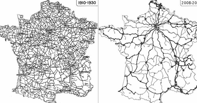 Tout a fait. C’est justement la combinaison de l’exode rural et de la voiture pour tous qui a complètement flingué les transports en commun dans les campagnes. Il y a un siècle, les campagnes étaient beaucoup mieux desservies. Un exemple qui l’illustre très bien, la carte des lignes de chemin de fer en France :