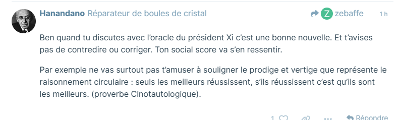 Exemple ici : tout le monde échange calmement sans accuser ou dénigrer l’autre puis tu arrives avec tes attaques personnelles en qualifiant autrui « d’oracle du président Xi ».