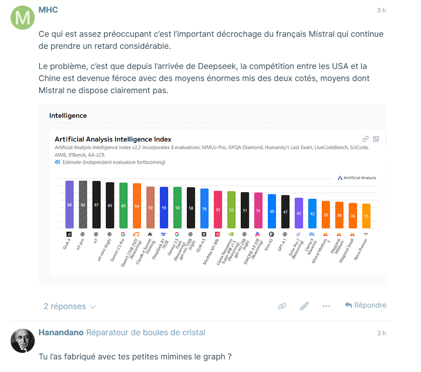 Pour le second commentaire, pardon mais c’est usant de devoir te demander systématiquement de fonder tes affirmations lunaires. Tu t’es rendu compte quand même que tu screens un tableau qui peut être modifié à loisir (en retirant/ajoutant des modèles) sans en indiquer l’origine ? Le simple fait que Mistral soit sur le tableau est en soi une démonstration que ce que tu dis est au moins à relativiser puisque tu tronques cet élément :