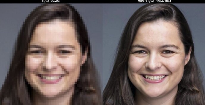Ici les 2 technologies (SR3 et CDM) permettent de simuler un rendu en plus haute définition avec une approche de raffinement itérative couplée à de l’intelligence artificielle. C’est impressionnant et bien sûr Google ne prétend pas « recréer » la photo d’origine. Même si le résultat pourrait être 100% identique (à l’oeil nu).