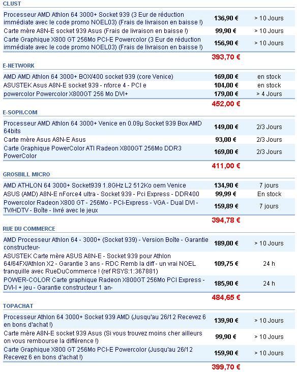 Une asrock dual-sata 2 pour la mobo (~70), un athlon 64 3000+ version box (~150) et une X800GT (~180).