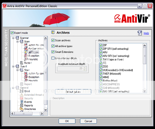 3) Dans l’option scanner allez sur « Archives » et faites en sorte que toutes les sortes d’archives soient scannées. Vous pouvez décocher « Limit recursion depth » pour qu’Antivir trouve un fichier qui se trouve au fin fond des bonne dizaine d’archives lorsqu’il scanne voter pc.