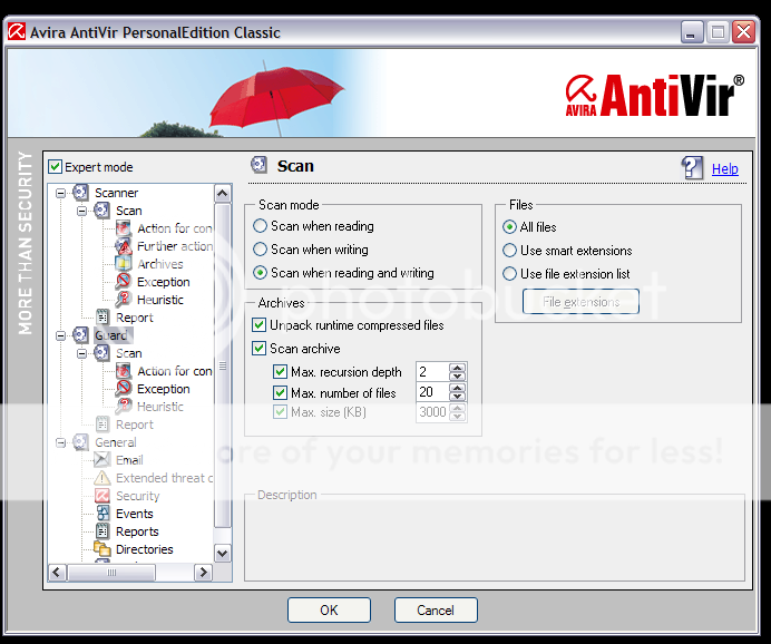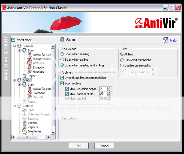 Dans l’option Archives de « Guard » j’ai augmenté le nombre de fichiers analysés, tout comme le « recursion depth » et la taille des fichiers, pour qu’Antivir puisse trouver plus de fichiers nuisibles en résident. Néanmoins n’augmentez pas trop cette valeur car cela risque de ralentir voter pc. En faisant un scan complet une fois par semaine Antivir trouvera les fichiers que Guard n’a pas remarqué.