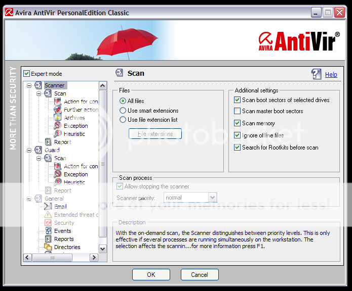 Faites en sorte qu’Antivir scan tous les fichiers. Activez aussi l’option qui permet qu’il cherche les rootkits à chaque scan. La priorité du scanner peut rester sur normal, mais pensez peut-être à mettre sur low si votre PC commence à dater. En low Antivir consomme moins de ressources, mais le scan risque d’être légèrement plus long, et vice versa avec le scanner en high.
