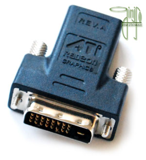 J’ai peut être un début de piste à explorer, mais rien n’est sûr à 100%. Tous les adaptateurs officiels qui marchent utilisent un adaptateur 24 + X broches, et non un 18 + X broches, ce qui signifie que peut être, seul les DVI Dual Link permettent le transfert (déblocage ?) du son via DVI => HDMI. Le connecteur Sapphire 18 + X broches (simple lien donc (voir photo en dessous)) par exemple ne sort pas de son. Peut être que la ruse d’ATI est de permettre le son uniquement si il reconnait un Dual link, parce que les single link ne semblent pas marcher.