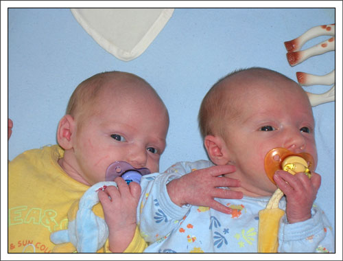 Allez, je vous annonce la venue au monde d’Eloann et Maëwenn, le 01/08/05, a 09h36 pour Eloann, 46cm 2kg760 et a 10h02 pour Maëwenn, 48cm et 3kg255. L’accouchement s’est bien passé, mais maintenant, les nuits sont courtes, tres courtes :sweet: