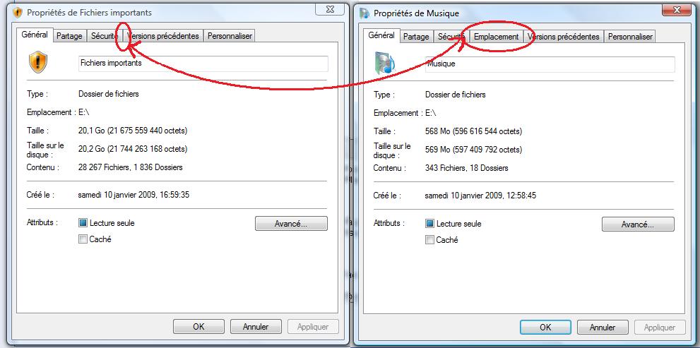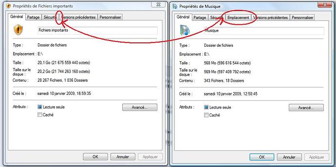 Je m’explique : Dans votre dossier utilisateur, il se trouve plusieurs dossiers (Musique, Image, Documents, Recherche etc…) En faisant un clic droit sur n’importe lequel de ces dossiers et en cliquant sur Propriétés, il apparait un onglet « Emplacement » qui permet de changer l’emplacement physique du dossier.
