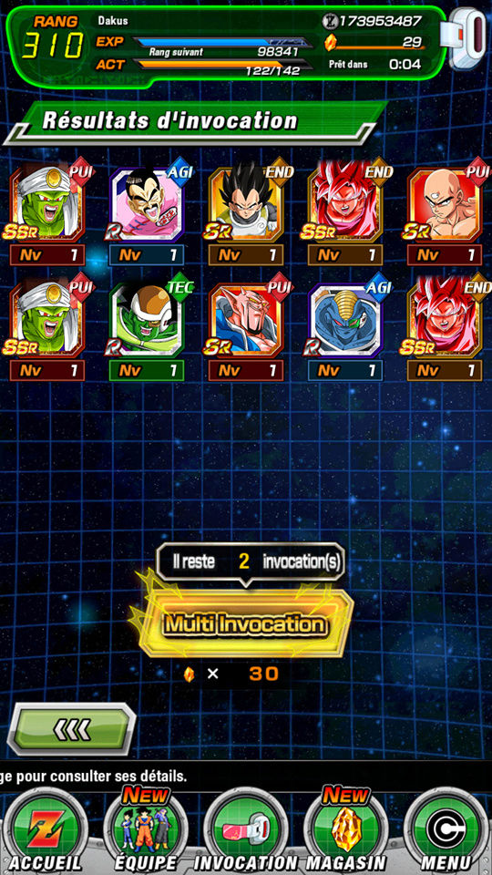 Durant ma première multi en janvier j’avais eu Rosé, Goku Blue Kaioken, Gogeta et Vegeta SSJ3 Pui, j’ai eu Goku SSJ4 en une multi (avec en plus Super Vegeto et un doublon de Gogeta), j’ai eu deux Super C-17 sur ma première multi, lors d’une multi sur le portail du Neo God Tier Kid Buu j’ai eu Golden Freezer Tec, puis là sur le portail du Neo God Tier Gogeta j’ai obtenu un Trunks Ikari + Beerus Tec sur la première multi, un deuxième Trunks Ikari sur la deuxième multi et un troisième Trunks Ikari + Vegeta GT SSJ3 sur la troisième multi ![]()