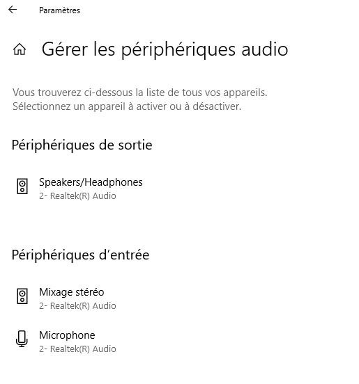 j’essaie de les faire reconnaitre il semble que windows 10 ,les détecte , mais dans la partie audio ,je n’ai que réaltek ma carte son