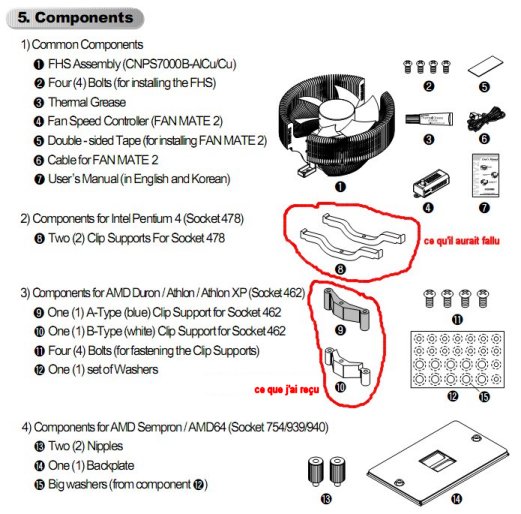 J’ai acheté d’occasion un Zalman CNPS7000B. Le vendeur indiquait le fournir avec juste les fixations pour socket 478 (Pentium 4) ce qui me convenait. Hors, j’ai eu la surprise de constater que les fixations livrées avec le ventirad n’étaient pas les bonnes (voir image jointe).