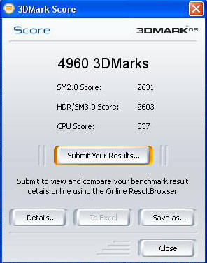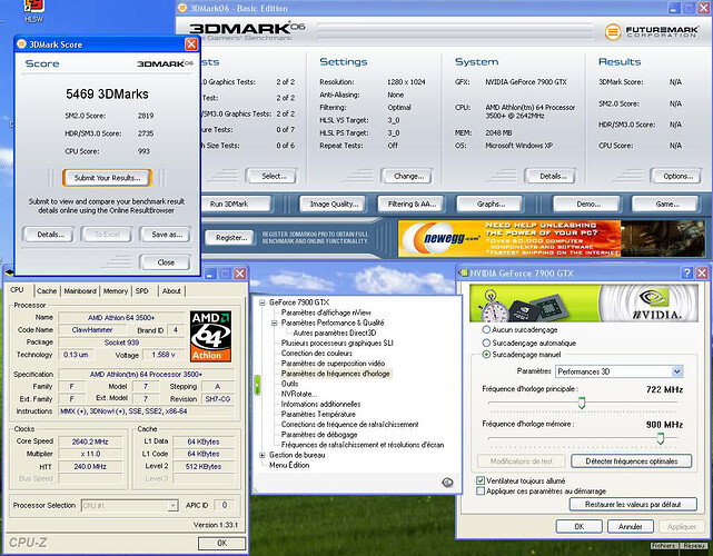 Voilà mes résultats sous 3DMark06 (1280x1024), je met le détail puisque le bench tient aussi compte du processeur (AMD 3500+).