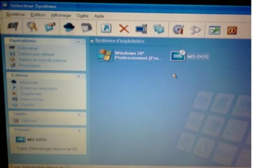 Par contre, le sélecteur système permet quand même de lancer lapplication Ghost qui se trouve cette fois ci sur un CD bootable (CD qui rempli exactement les mêmes fonctions que la disquette bootable, mais de façon plus pratique), il me suffit dinsérer le CD dans le lecteur et de cliquer sur licône MS-DOS, donc au bout du compte le sélecteur système est quand même capable de lancer le boot de Ghost, mais pas comme je le souhaite.
