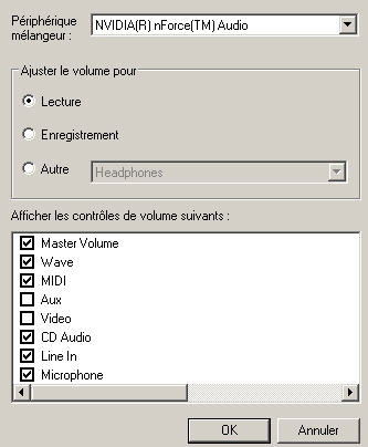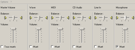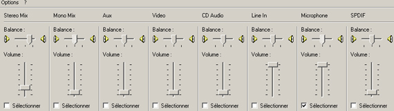 Refaites la même manipulation (Option > Propriété) mais au lieu de cocher "Lecture" cochez "Enregistrement" et ensuite plus bas cochez "Microphone" ! Faites "Ok" . Vous arrivez donc sur la fenêtre précédente (encore une fois) et là cochez "Sélectionner" dans la colonne "Microphone". Mettez alors le volume du microphone à fond, comme ci-dessous: