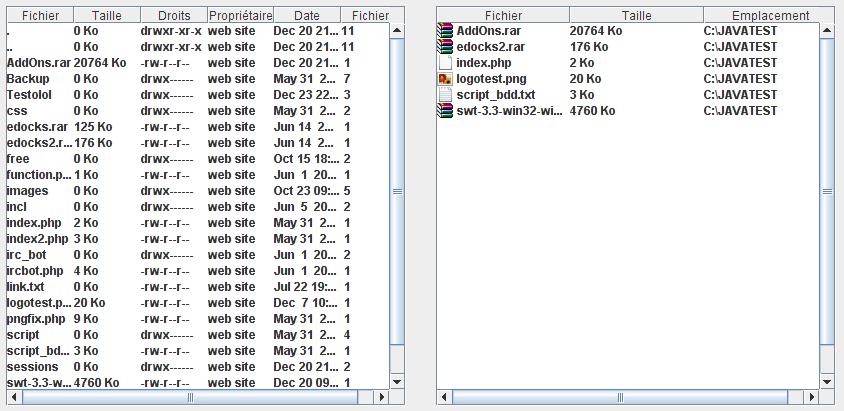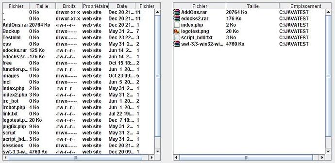 J’ai deux JList, une pour l’arborescence du serveur, l’autre pour celle du client. Pour ce qui est du client j’arrive à afficher l’icone correspondante du fichier avec getSystemIcon(fichier), par contre pour les icones des fichiers du serveur c’est une autre affaire. Je ne peux pas utiliser cette méthode car le fichier doit exister sur le disque pour qu’elle fonctionne (FileNotFoundException).