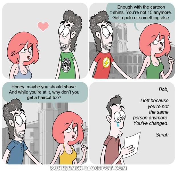 Avec la planche du mec et de la fille, c’est un peu la même chose avec ma copine, elle a fixé tellement de règles et d’exigences sur mon habillement et ma façon d’être que j’ai fini par changer et elle veut maintenant que je sois comme au début… :icon_biggrin: