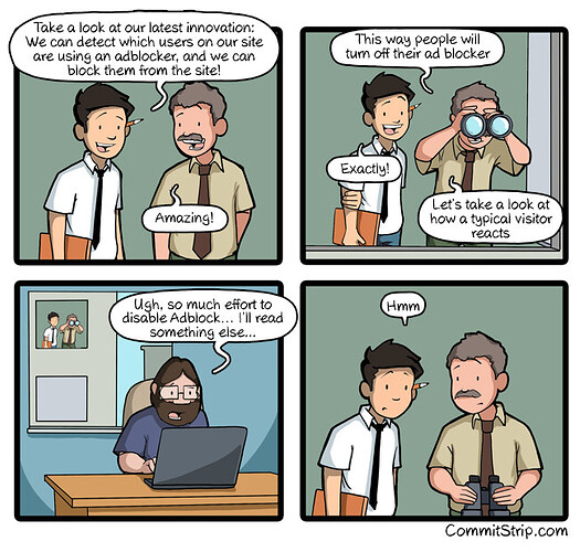 Ce que j’adore aussi, c’est la mauvaise fois de certain sites… Certains sont honnêtes et affichent clairement la couleur, expliquant que le site peut vivre grâce à ses revenus etc… mais d’autres assument nettement moins, en tournant le texte pour faire croire que le bloqueur de pub provoque des problèmes techniques (je pense en particulier au site du Monde)…