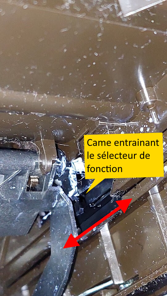 Une came entrainant l’arbre de sélection des fonctions (chargement, recto verso) est sortie de la glissière d’entrainement. Usure ou jeu sur l’axe. Remettre la came en place, de telle façon qu’elle soit entrainée par l’encoche dans la glissière en plastique noir.