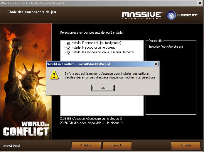 J’essaie d’installer World in Conflict : Complete Edition, mais après avoir choisi un dossier d’installation, je tombe sur un paradoxe assez étrange, digne d’un bug Windows mal traduit. Comme cela est assez long à expliquer, le plus simple est de vous le montrer en image :