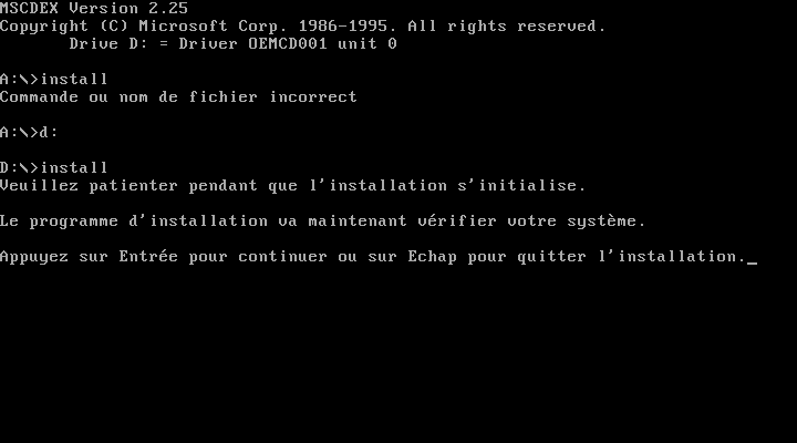 Tu peux faire « dir d: » pour voir si tu as ton cd rom en d: avec un fichier install.exe, puis si c’est ok tu vas sur d: et tapes install