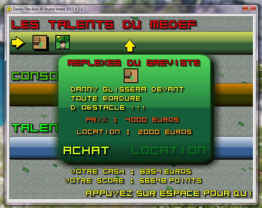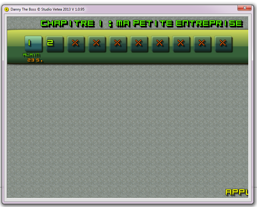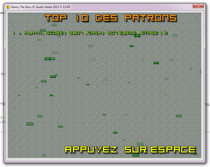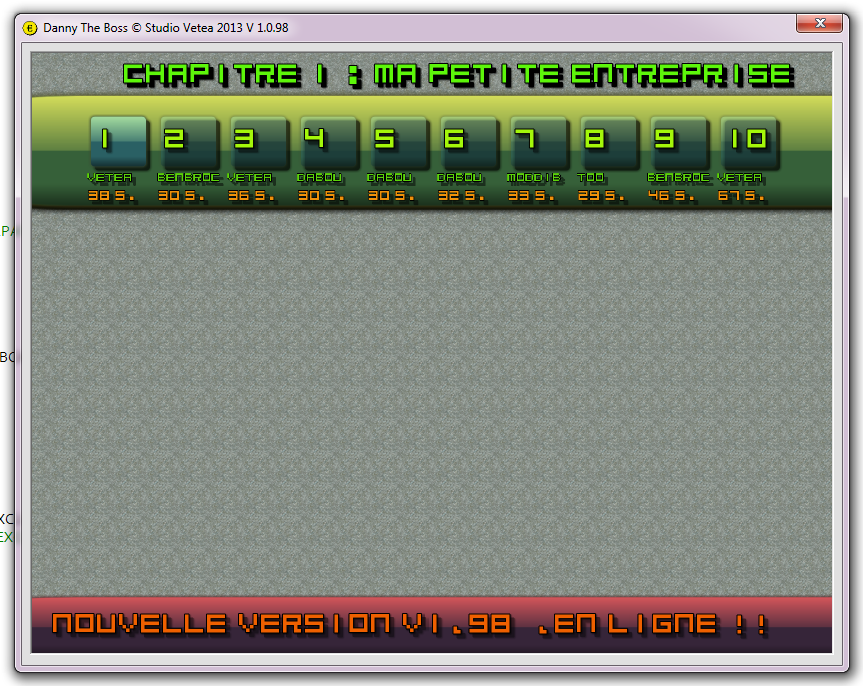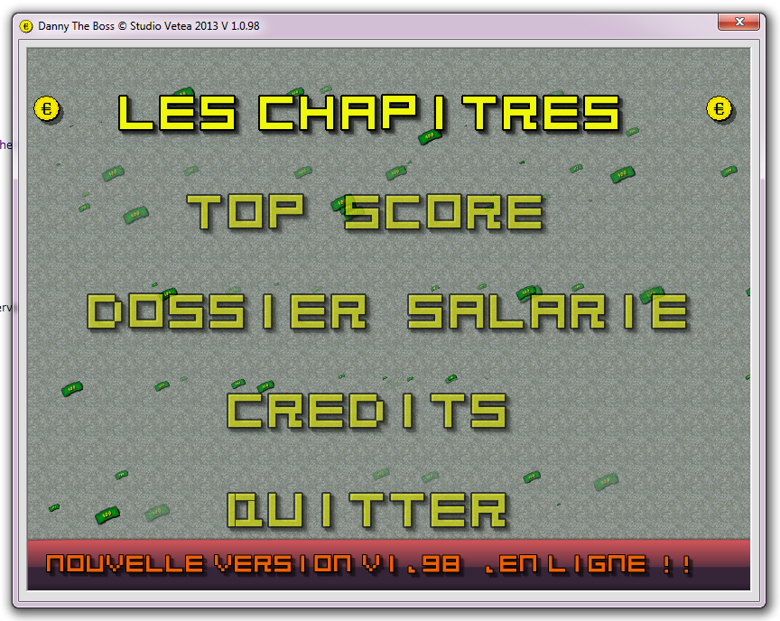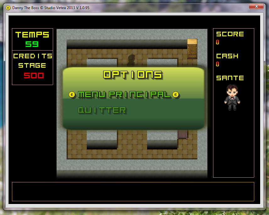 Dans les prochaines versions, la progression sera sauvegardée ainsi que le score et le cash de Danny et la mise en place du E - Scoring fera son apparition.