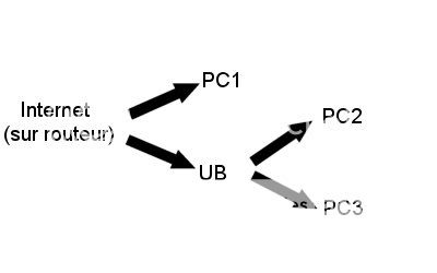 Est ce que ton hub fait partie du modem ADSL ? Ou est une entité supplémentaire ? Est-ce un HUB ou un Switch ? Pourquoi l’utilises-tu ? Pourquoi les 3 PCs ne sont-ils pas sur le meme noeud physique ?