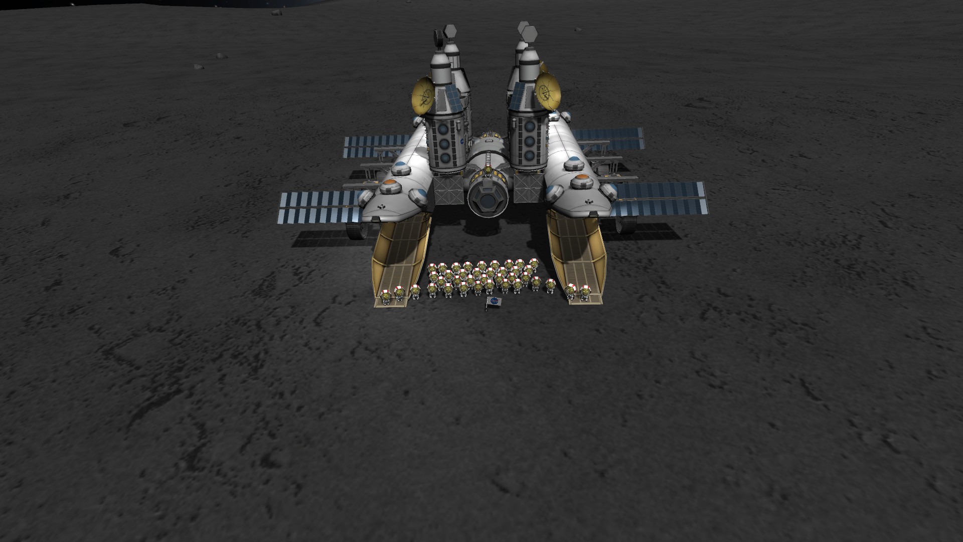Ça demande un certain équipage… en effet, une capacité (minimale) de 39 Kerbonautes sont « nécessaire », mais cependant via les soutes latérales pouvant servir de barge de débarquement, ce nombre selon la disposition des équipements adéquats pourrait permettre l’emport entre 50 et 200 (voir plus :whistle: ) de cobayes Kerbals.