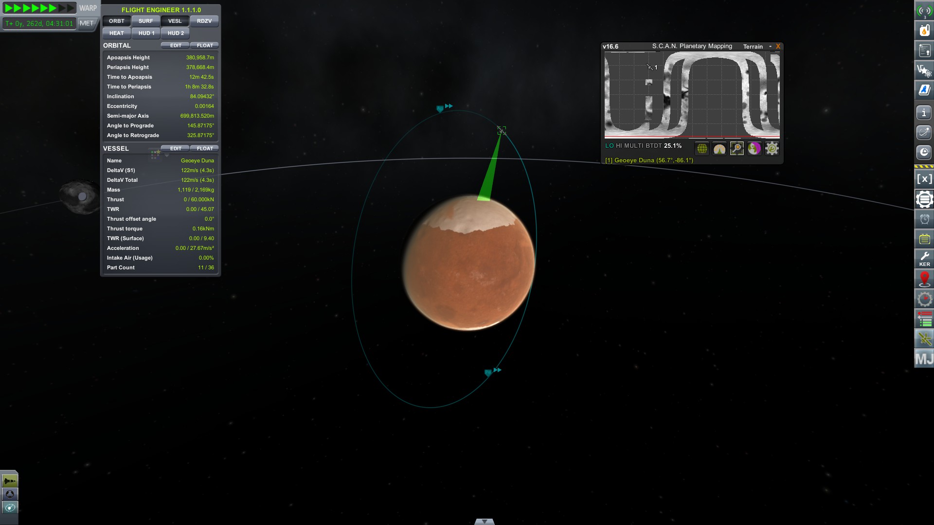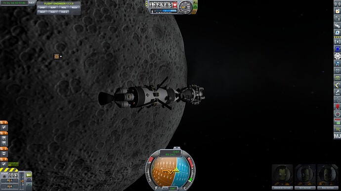 Par contre, mes calculs carburants sont foireux (j’avais oublié de compter le module d’atterrissage… du coup j’ai beaucoup moins de DeltaV que prévu…), c’est suffisant pour la Mun, ça ne le sera pas pour Duna. Faudra que je revois ça.