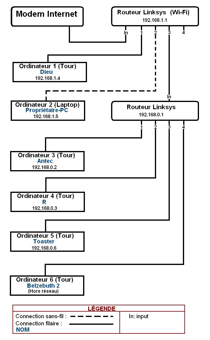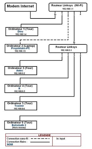Je vous écrit parce que j’ai un problème avec la communication entre mes ordinateurs. J’ai au total 5 ordinateurs à faire communiquer entre eux, mais certains ne reçoivent pas l’information. Pour commencer, je vous met un schéma de mon réseau domestique pour que vous puissiez visualiser.