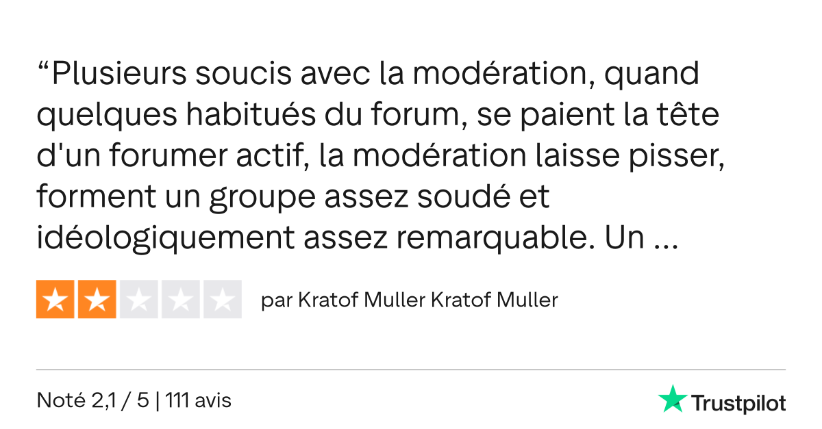 Regarde Trustpilot … A ton avis les messages de Chris_Angel et Kratof Muller Kratof Muller sont écrits par la même personne ? … T’es nul pour reconnaître le style des gens car ça frappe aux yeux que c’est pas du tout la même personne sauf si elle a fait un effort de ouufff ce que j’en doute.