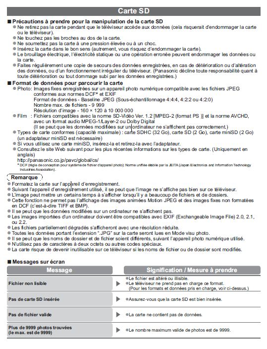 Je viens d’acheter un écran Panasonic Viera tx-42u10e. Il est muni d’un lecteur de carte sd qui permet de lire des vidéos compatibles SD-Video et AVCHD. Mon problème est que je ne parviens pas à trouver un format compatible avec ces normes. J’ai essayé plusieurs fichiers « .avi » ainsi que des fichiers filmés à partir d’un appareil d’un appareil photo numérique. Faut-il convertir ces fichiers et si oui en quel format?
