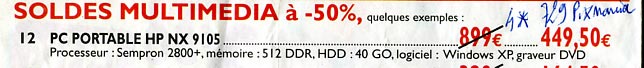 Pour ma part, petit ordinateur portable (HP NX9105) à 450 : J’étais parmis les premiers arrivés (1heure avant l’ouverture), au final, au lieu d’ouvrir la porte où tout le monde attendait, ils ont ouverts une porte lattérale :na: . Donc les derniers arrivés, premiers servis !