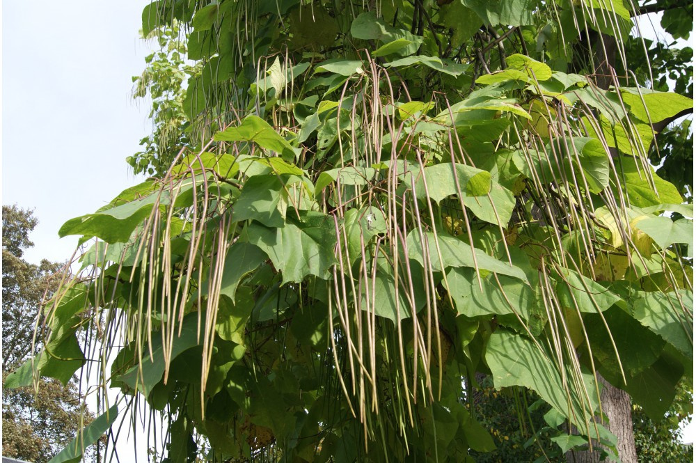 Et j’hésite toujours à mettre un Catalpa (peut-être un demi-tige moins haut dés le départ ? j’avais un haute tige dans mon premier jardin) , j’adore cet arbre mais j’ai peur de devoir trop l’élaguer…il est très particulier pour ses très grandes feuilles, ses fleurs parfumées en Juillet-Août, et ses fruits bizarres qui restent dessus tout l’hiver :