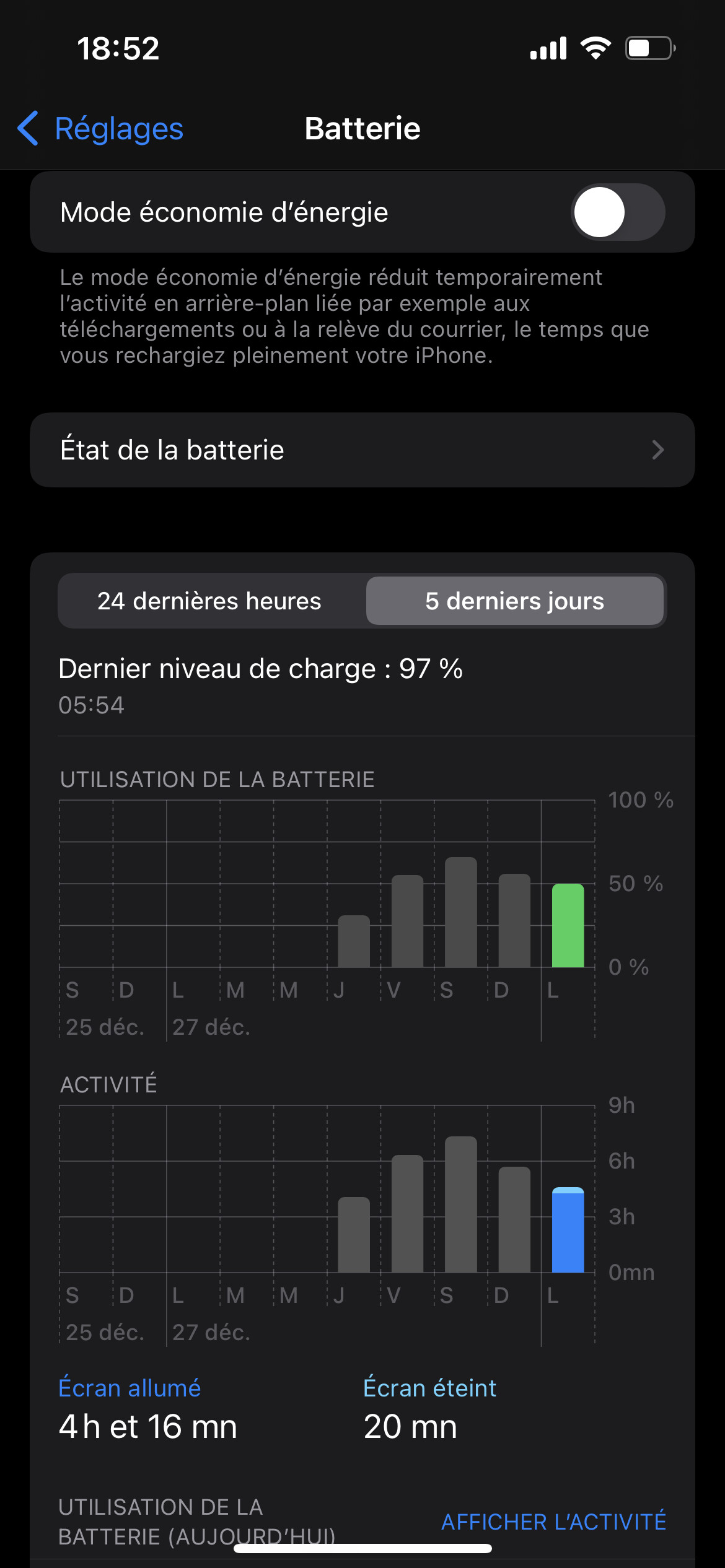 Je suis actuellement à 50 % de batterie après une journée bien chargée, franchement Apple ont fait fort cette année