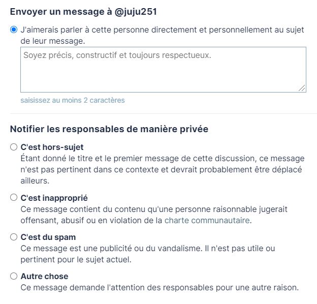 En réfléchissant à comment d’autres membres de niveau 2 ont pu m’envoyer des mp’s directs, je pense qu’ils ont fait comme ceci : cliquer sur les 3 points en bas d’un message quelconque de la personne que tu veux contacter, puis cliquer sur le drapeau pour signalement, et tu auras ça (cocher la première option, bien sûr, votre discussion sera privée tant que vous n’invitez pas d’autres personnes à la rejoindre) :